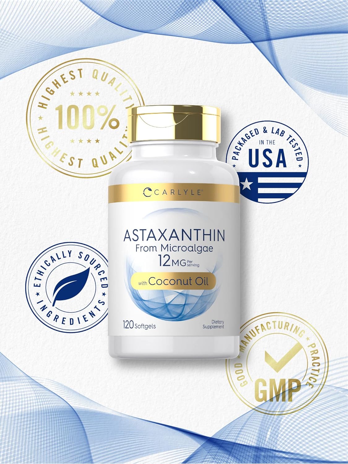 Carlyle Astaxanthin 12 mg es un potente antioxidante natural derivado de microalgas (Haematococcus pluvialis), formulado con aceite de coco virgen para mejorar su absorción. Cada cápsula blanda aporta 12 mg de astaxantina, ideal para apoyar la salud ocular, la piel, el sistema inmunológico y la protección celular contra el estrés oxidativo. Recomendado para adultos con fatiga visual, exposición solar intensa o protocolos antiinflamatorios. Fabricado en EE. UU. bajo estándares GMP, libre de gluten, OMG y alérgenos comunes.