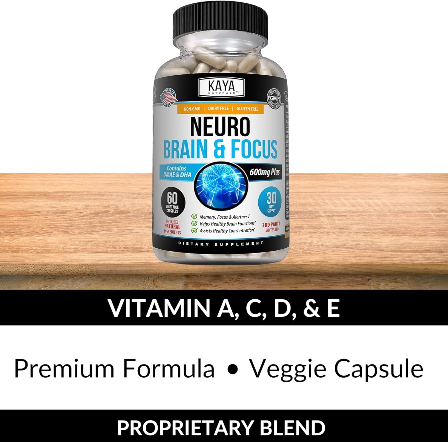 Kaya Neuro Brain & Focus Plus es un suplemento nootrópico que combina extractos herbales, aminoácidos y vitaminas para apoyar la memoria, concentración, claridad mental y rendimiento cognitivo. Cada porción de 2 cápsulas aporta 600 mg de mezcla activa, incluyendo Ginkgo biloba, Bacopa monnieri, DMAE, Rhodiola rosea, L-glutamina, y vitaminas B6 y B12, ideal para adultos con fatiga mental, estrés cognitivo o protocolos de enfoque prolongado. Fórmula vegetariana, libre de gluten, OMG y alérgenos comunes. Fabricado en EE. UU. bajo estándares GMP.